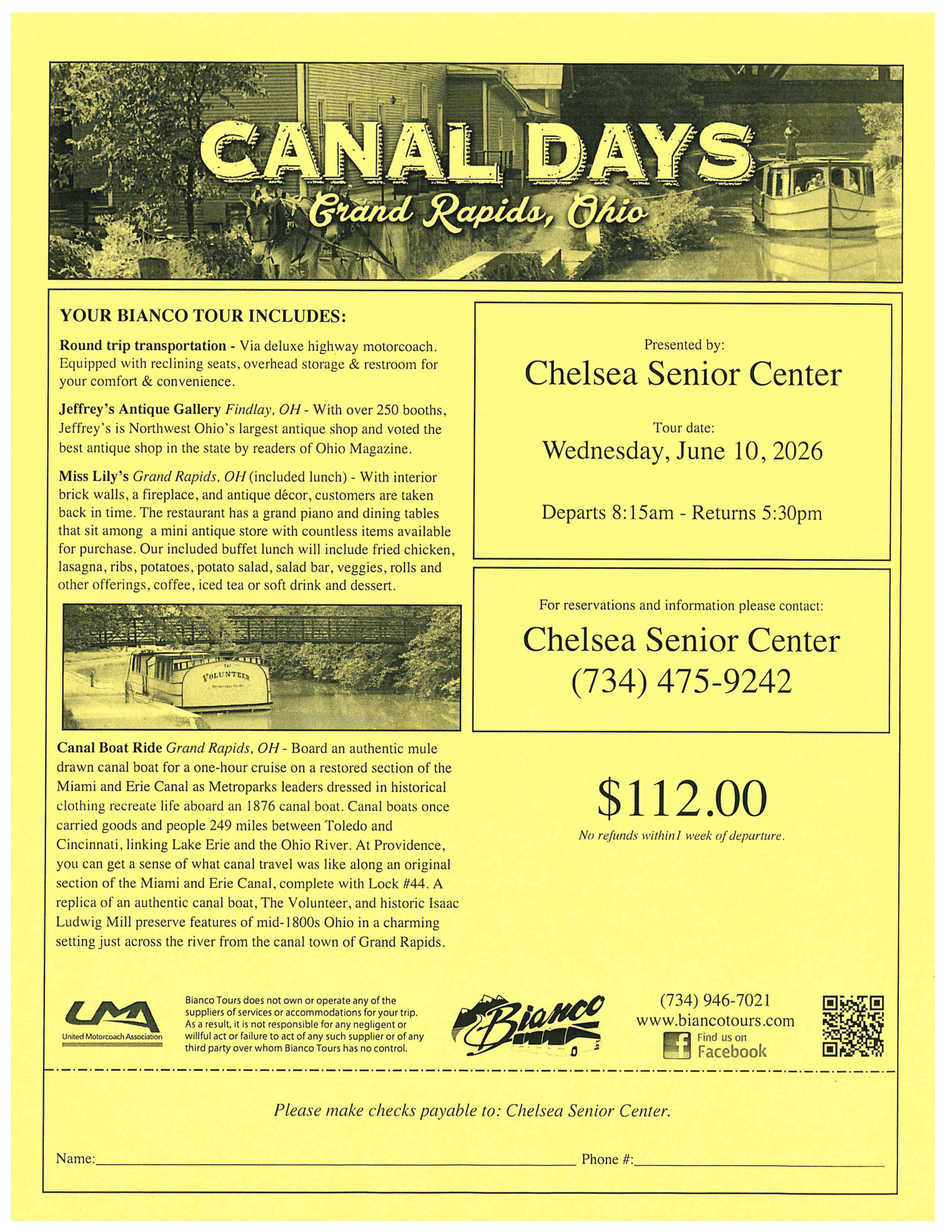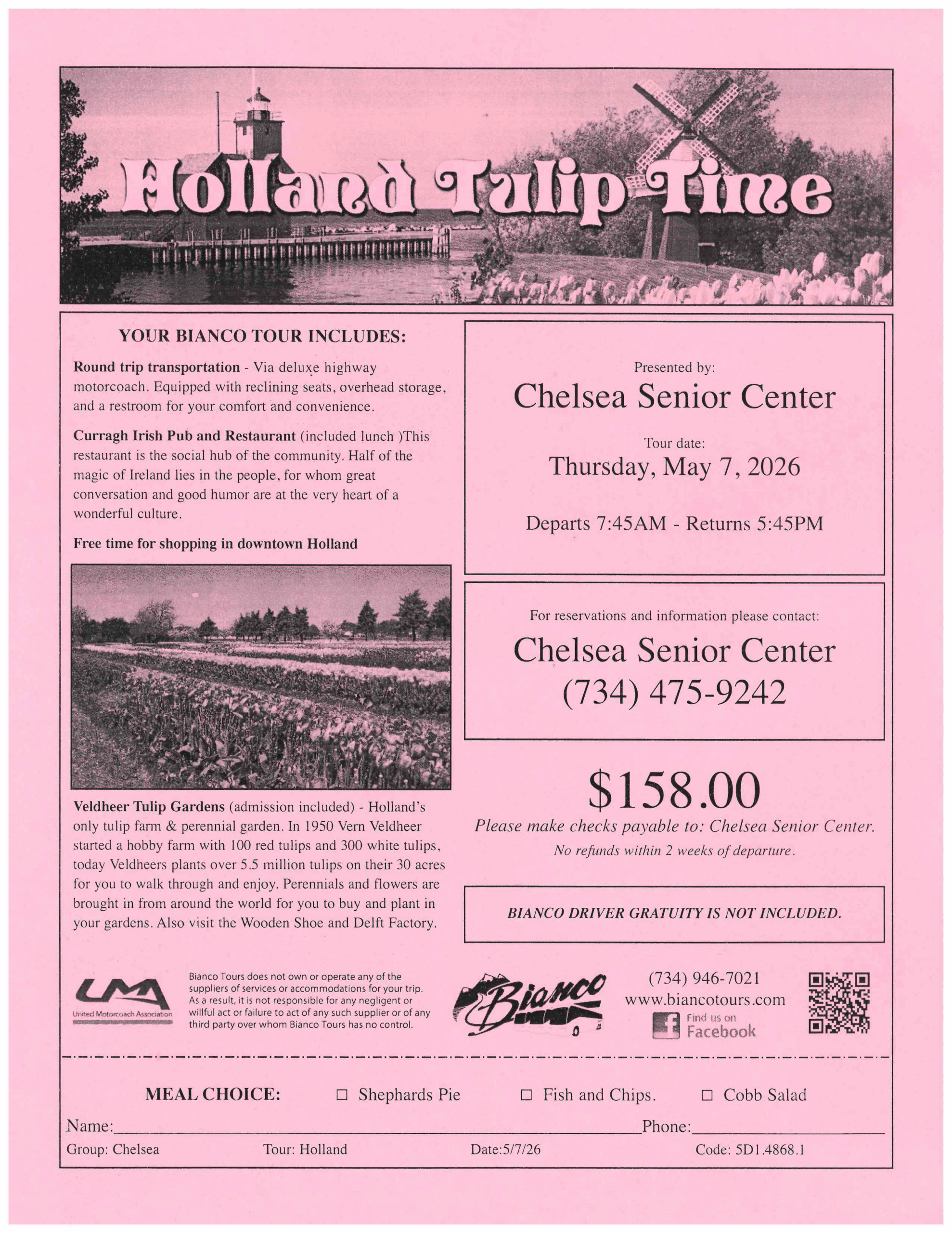 Please contact us about travel insurance through independent travel companies. Travel policies for trips arranged through vendors are listed on the trip flyer. Members are encouraged to purchase insurance. Adult travelers of any age are invited to enjoy Chelsea Senior Center’s escorted trips.